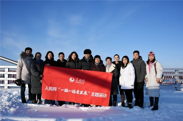 人民网“一撇一捺看发展”采访团在即将开通的中俄黑龙江大桥上留影。人民网 商海林摄