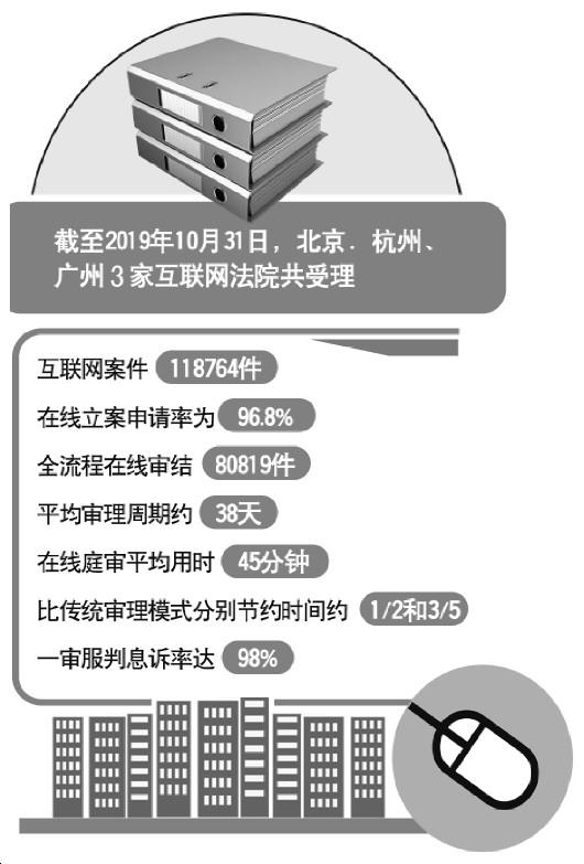 2017年以来,我国先后在杭州、北京、广州设立3家互联网法院。全国多地法院也根据实际需要,设立一批互联网审判庭、合议庭和审判团队。论坛召开前夕发布的《中国法院的互联网司法》白皮书显示,截至2019年10月31日,上述3家互联网法院共受理互联网案件118764件,在线立案申请率为96.8%,全流程在线审结80819件,平均审理周期约38天,在线庭审平均用时45分钟,比传统审理模式分别节约时间约二分之一和五分之三,一审服判息诉率达98%。