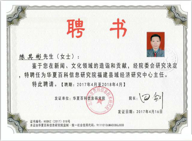 华夏百科信息研究院福建县域经济文化研究中心主任陈其彬,对鼎力支持中心成立的全体领导和各界同仁表示感谢。他指出,华夏百科信息研究院福建县域经济文化研究中心的成立,标志着福建县域经济、县域文化和史志研究事业迈进新征程,必将推动福建县域经济和县域文化的发展,开启新纪元,载入新史册。