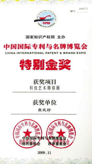 在国家知识产权局主办的第六届“中国国际专利与名牌博览会”上,殷凤珍先生的发明专利“科技艺术棉球画”获最高荣誉——“特别金奖”!这是对她多年来艺术创新的褒奖。该科技成果为艺术上的一大创新!