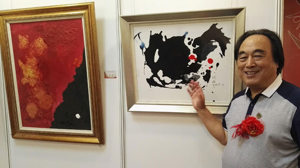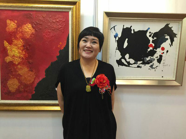 中国文化经济国际交流协会副主席代西和她参展的作品。
