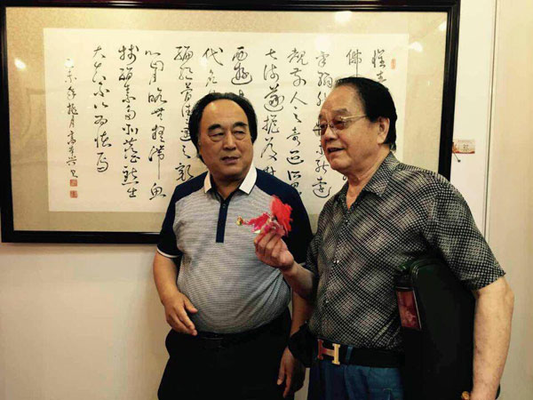 中国文化经济国际交流协会副主席王宝玺用鲜花风趣幽默的为获奖的协会中国诗书画印艺术研究院研究员高本兴祝贺。