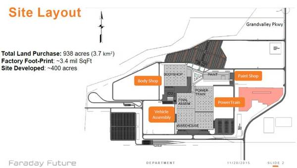 一份由 PingWest品玩获得,提交人署名为法拉第全球制造副总裁达格·里克霍恩 (Dag Reckhorn) 的项目文件显示,法拉第将在内华达州克拉克郡北拉斯维加斯市的东北角 APEX 工业园内,购置一块总面积 938 英亩(约合 3.8 平方公里)的土地,用于建造法拉第电动汽车生产工厂。