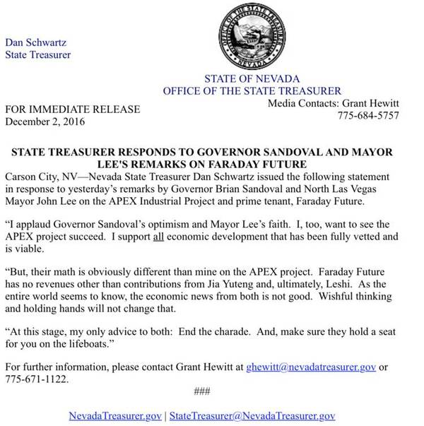 光在 2016 年,施沃茨就以内华达州财长身份共发表过 6 封质疑法拉第的公开信。