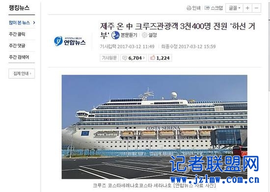 据韩联社12日报道,正当中国发出“旅游禁韩令”持续发酵之时,韩国首次发生了乘坐国际邮轮来到济州的3400余名中国团体游客拒绝下船事件。