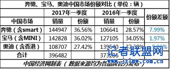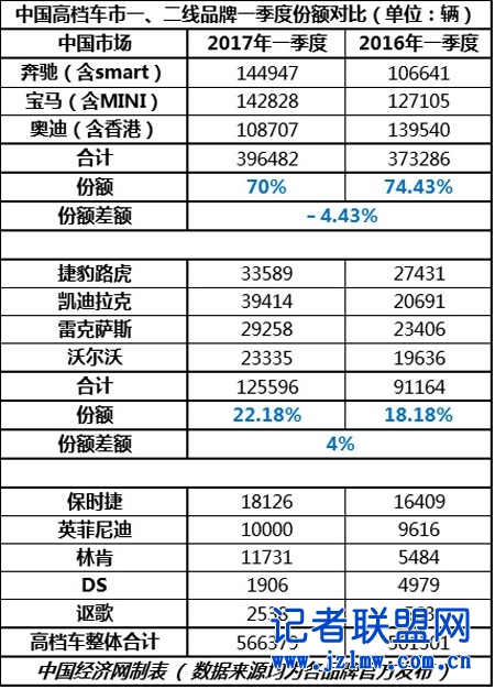 那么,经历了一番动荡与洗牌之后,到底是谁抢了昔日龙头老大——奥迪的市场份额?如今国内高档车市场格局到底是怎样的?通过对比2017年及2016年一季度销量数据,中国经济网汽车频道为您呈现这一市场的真相。