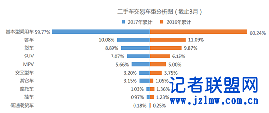 分车型来看,一季度二手车交易中轿车仍为主要流通车型,占比达到59.77%,其次为客车占比10.08%,货车占比8.89%,SUV占比7.07% ,MPV占比5.66%。相比2016年, MPV、SUV占比均有所增加。