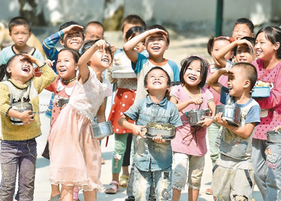 在广西大化瑶族自治县板升乡弄雷小学,孩子们在操场上吃营养午餐。