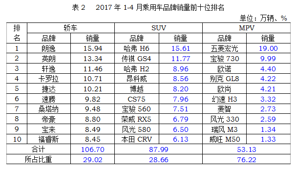 1-4月,乘用车共销售766.98万辆,同比增长2.47%,增速比一季度减缓2.16个百分点。其中:基本型乘用车(轿车)销售367.74万辆,同比下降1.41%;运动型多用途乘用车(SUV)销售307.05万辆,同比增长17.99%;多功能乘用车(MPV)销售69.71万辆,同比下降17.92%;交叉型乘用车销售22.48万辆,同比下降25.86%。