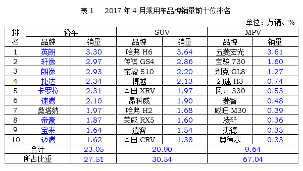 乘用车分车型生产企业销售情况:4月,销量排名前十位的轿车生产企业依次为:一汽大众、上汽大众、上汽通用、东风有限(本部)、吉利控股、一汽丰田、长安福特、广汽本田、华晨宝马和北京现代。与上月相比,华晨宝马销量呈小幅增长,其他企业均呈下降。4月,上述十家企业共销售60.30万辆,占轿车销售总量的71.97%。
