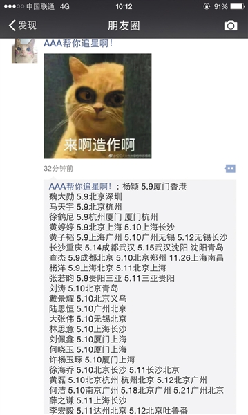 微信卖家在朋友圈叫卖国内艺人相关航班信息。