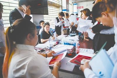 5月8日,河北燕郊的房管局大厅,房产中介正在为购房者办理相关手续。今年新的购房政策出台以后,燕郊住房交易量有所下降。