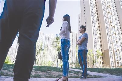 5月7日,河北大厂,赵斯明(图中)与丈夫在房产中介的带领下来到小区看一套二手房。