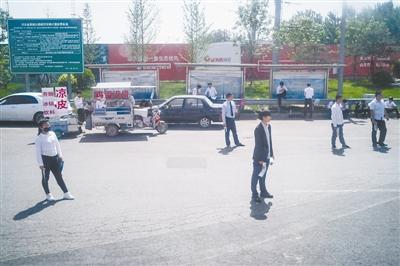 5月6日,河北固安,一些房产中介在高速路口等待购房者。
