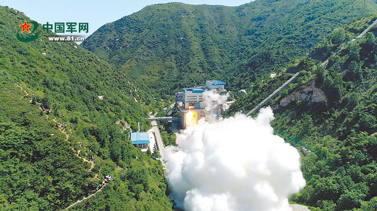 在中国航天科技集团六院新一代火箭发动机试验区,901号试车台在为我国首台泵后摆火箭发动机进行测试。