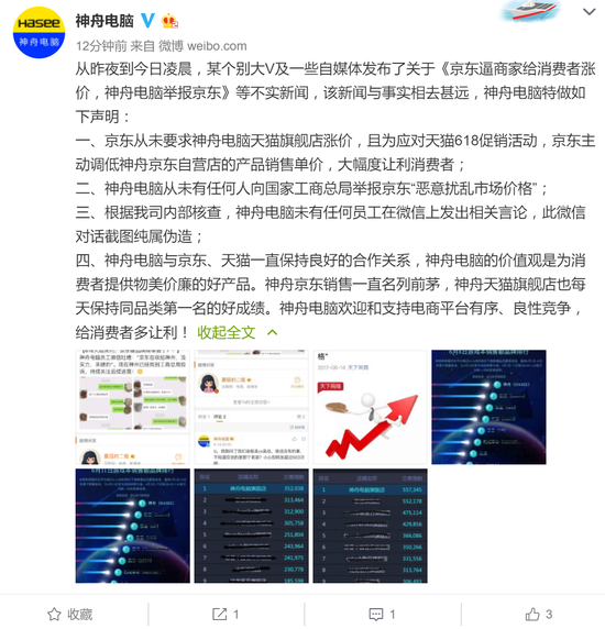 据悉,针对此报道,神舟电脑今日也已通过官方微博公开进行了澄清。神州电脑称,京东从未要求神舟电脑天猫旗舰店涨价,而神舟电脑从未有任何人向国家工商总局举报京东“恶意扰乱市场价格”。