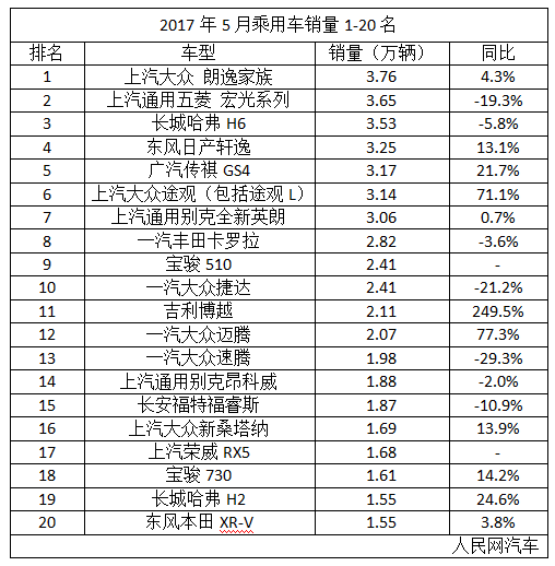 梳理乘联会数据后可以发现,车市5月销售量实现整体增长,各个品牌旗下的热门车型也基本都获得了理想的市场表现。这其中销量前20名的车型如下。