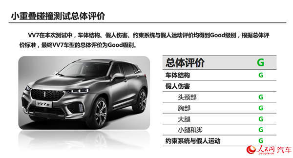 “小重叠面碰撞测试”是美国公路保险协会(IIHS)首先倡导的碰撞测试,被认为是汽车正面碰撞试验中对车辆安全性要求最严苛的测试。据中国汽车研究中心首席专家、研究员级高级工程师刘志新介绍,小重叠碰撞是测试车辆以40英里/小时(64公里/小时)的速度撞向固定的刚性壁障,且重叠面积只相当于车身宽度的25%,小于目前NCAP正面碰撞测试的40%重叠面积,因此驾驶员前方部位受到的冲击力加大,对车辆的安全性考验更严格。测试结果主要考核三部分,包括:车体结构、约束系统/假人运动学、假人伤害值。碰撞的成绩则被分为四个等级,分别是“good(优秀)、Acceptable(良好)、Marginal(达标)、Poor(不及格)”四等。