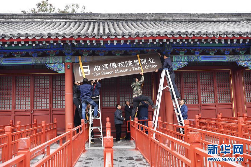 10月10日,工作人员将故宫博物院售票处牌匾摘下。从10月10日起,故宫正式实行全网售票,每天8万张门票全部在网上销售,不再进行现场售票。此外,故宫将设置综合服务窗口,帮助外籍观众和部分没有线上支付能力的观众代客下单。新华社记者金良快摄