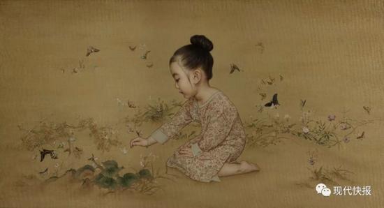 万里举例,戏蝶这幅画作,其实就是朵朵跪在地上,抓玩玩具,“ 我捕捉了她的动作和神态后,配上蝴蝶、花丛,东方意境一下就出来了。”