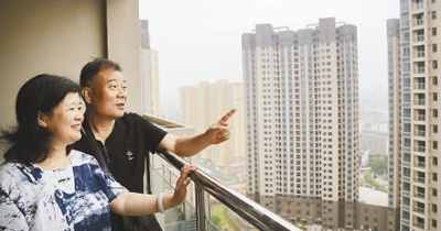 图为回迁户张明(右)和家人观赏新居周边环境。