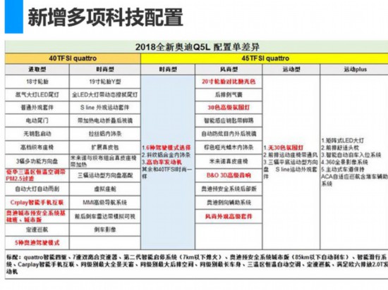 Q5是一汽-大众奥迪旗下的一款中型豪华SUV,本代车型已临近换代,全新一代奥迪Q5L已于3月29日首发,相比现款车型尺寸大幅度加长。近日,网上车市从一汽-大众奥迪经销商处获得了一组全新一代Q5L的配置表。新车搭载多项科技配置,标配无钥匙进入、电动尾门、Carplay智能手机互联系统等,动力系统搭载2.0L涡轮增压发动机,预计将于7月2日正式上市。