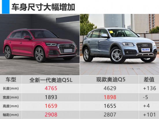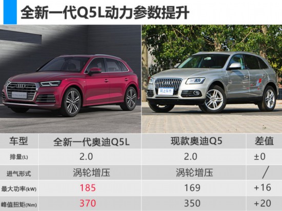 全新一代奥迪Q5L根据中国市场需求对车身尺寸进行了加大,长宽高分别为4765×1893×1659mm,轴距2908mm,相比现款国产Q5车型,长度增加136mm,轴距加长101mm。动力系统搭载大众第三代EA888 2.0L(高、低功率)涡轮增压发动机,最大功率分别为185kW与140kW,其中高功率不仅最大功率提升16kW(现款2.0T为169kW),每百公里综合油耗还下降了0.1L,为7.3L。新车传动系统匹配双离合变速箱,并拥有奥迪quattro全时四轮驱动系统。(丁祎)
