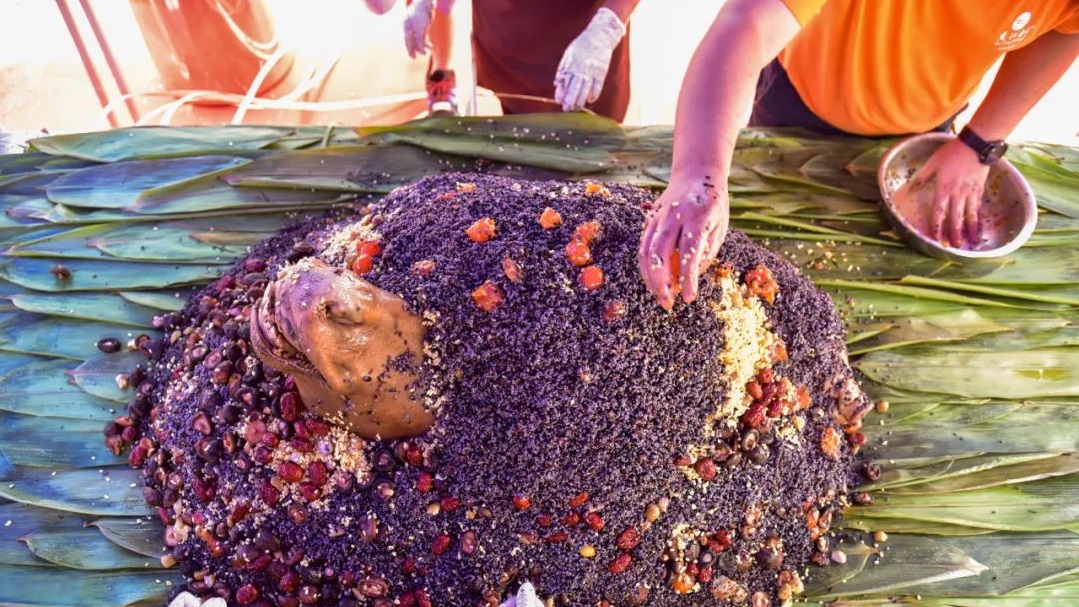 6月20日上午11时许,经过1天1夜的“熬战”,一只重达588斤的大“粽王”,在广西柳州市融水苗族自治县“出浴”。这只史诗级的巨无霸,包进了一个40斤重的牛头,一整只香猪,两大盆五花肉和数只鸡鸭。这种“荤荤荤荤荤素”非常平衡的搭配,就问你们怕了吗?