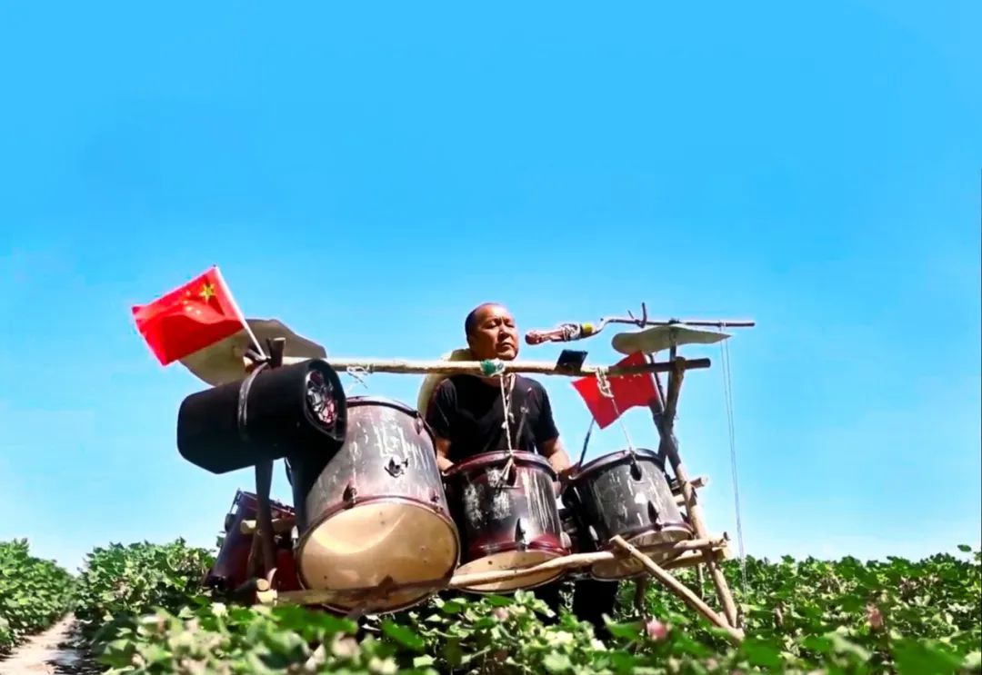 近日,网络上一段新疆农民在田间地头表演架子鼓的视频火了。视频中,绿油油的棉花地中,一位农民正激情澎湃地表演着架子鼓,同时放声高歌……