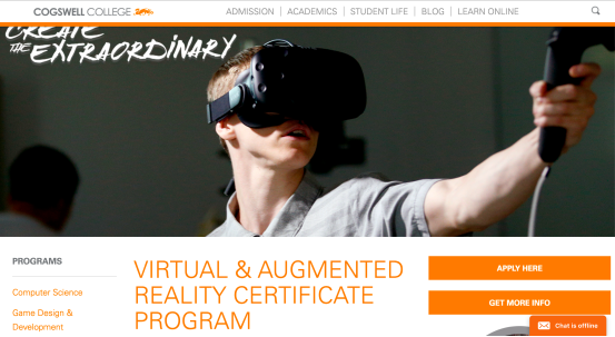 此外,美国格斯韦尔学院在2016年夏季开设了全球首个VR及AR专业培训项目,virtual reality & augmented reality certificate program(VR及AR资格认证课程)。这一门课程的上课时间安排在周末,为所有愿意学习的人群提供帮助。课程邀请专业的计算机图形师、工程师和数字化专家提供培训,完成课程的学员可以获得项目证书。