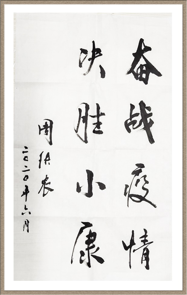 ▲第十一届全国人大常委会副委员长周铁农为中华大地之光征评活动提写的“奋战疫情·决胜小康”