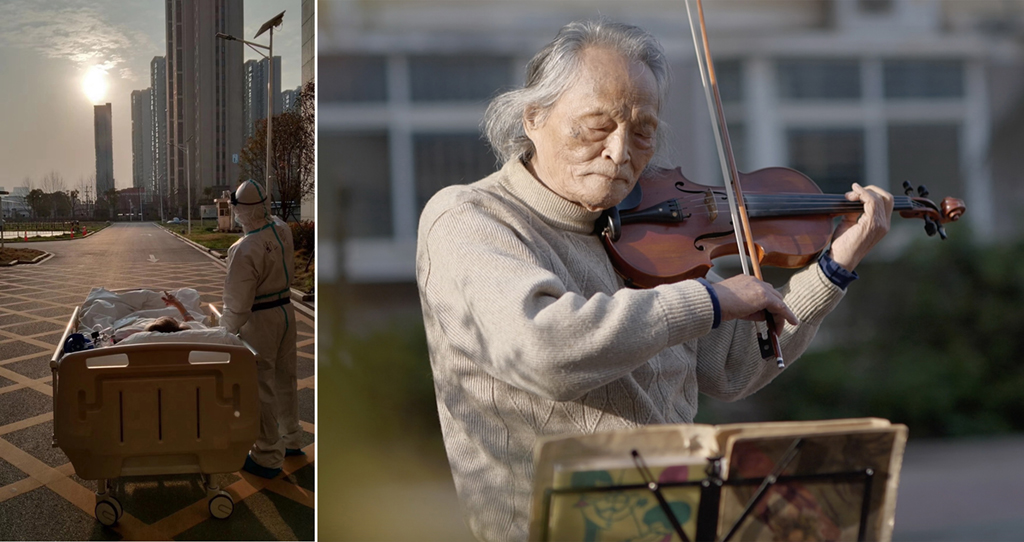 这是一张拼版照片,左图为:2020年3月5日傍晚,在湖北省武汉大学人民医院东院,复旦大学附属中山医院支援湖北医疗队医生在护送患者王欣做CT的途中停下,让住院近一个月的老人欣赏久违的日落(甘俊超 摄);右图为:3月24日,“看夕阳的老人”王欣在东西湖区园艺花城小区内拉小提琴(新华社记者熊琦摄)。新华社发