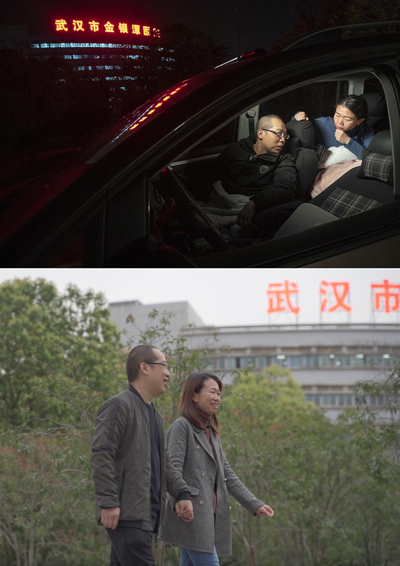 这是一张拼版照片,上图为:2020年2月22日晚,武汉市金银潭医院的医护夫妻涂盛锦(左)与曹珊在车内聊天。从大年初一开始,两人就住进车里,为在疫情中抢救病患,争分夺秒,以车为家;下图为:3月23日,武汉市金银潭医院的医护夫妻涂盛锦和曹珊在下班路上。新华社记者 熊琦 摄