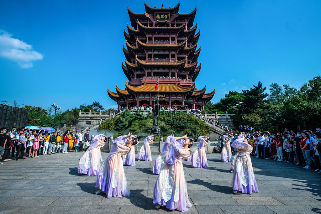 2020年10月1日,游客在武汉黄鹤楼景区观看演出。新华社记者 肖艺九 摄