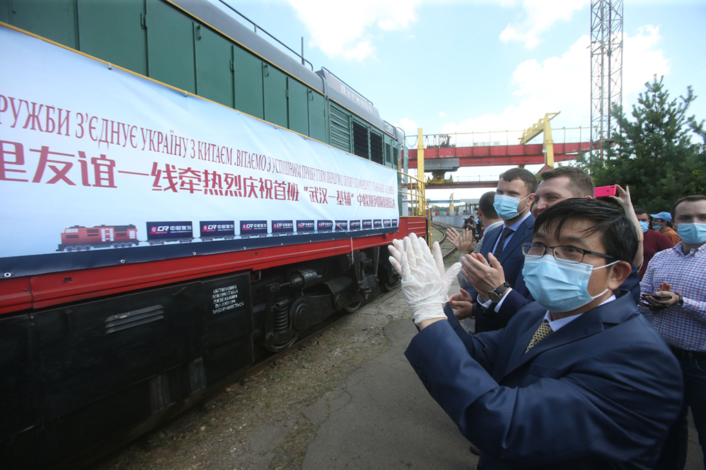 2020年7月6日,在乌克兰首都基辅市利斯基货运站,中乌两国代表迎接“武汉—基辅”中欧班列。该班列是中国华中地区首列直达乌克兰的中欧班列。新华社发(谢尔盖·斯塔拉斯坚科摄)