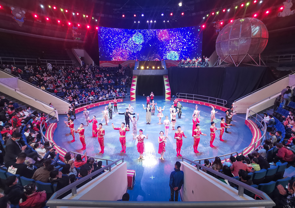 4月3日,武汉杂技厅的演员们在演出后向观众谢幕。新华社记者 肖艺九 摄