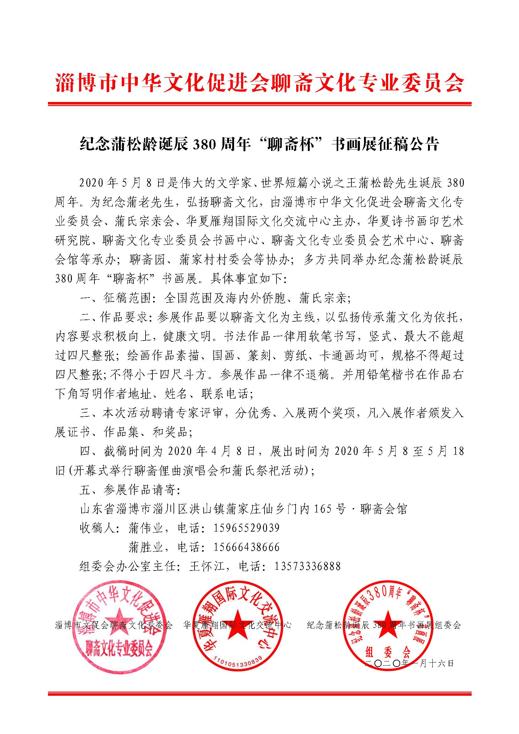 根据会议下发了淄博市中华文化促进会聊斋文化专业委员会关于“关于纪念蒲松龄诞辰380周年(聊斋杯)国际书画展”等系列活动的文件: