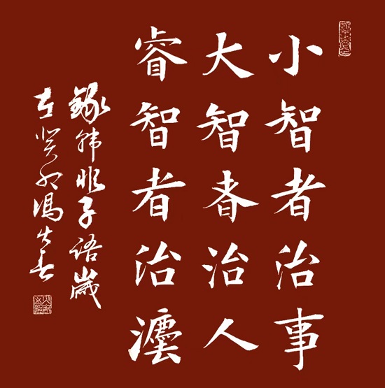 四是布势大气。欧阳询《九成宫醴泉铭》之所以被王者屈膝,令书家仰止,主要是其书法艺术有气势有气场,看似奇其实正,貌似方其实圆,在欧体诸碑中被称奉敕之书,是名符其实的。通观品味《九成宫醴泉铭》全文,神就神在多笔划字不觉大、少笔划字不觉小,多笔划字不觉臃、少笔划字不觉空。妙就妙在上下字重心一条线,左右字水平一排齐,也就是说平观无错位,纵看无偏斜,个性飞扬,稳重如山,给人留下许多想象空间和回味无穷的留恋。试看当今,许多书法家及爱好者,写出的书法作品,单个字很好看,平放展示也美观,但是一装裱挂起来,就感觉别别扭扭、不足显现,有遗憾之感,既入不了书展也获不了赛奖。主要原因就是缺少《九成宫醴泉铭》这种书法作品的法度冲击和视觉审美,如果学到《九成宫醴泉铭》大气章法布局,厚重严谨的取势布阵,就会创作出优秀的书法精品,提升书法技艺的层次境界。