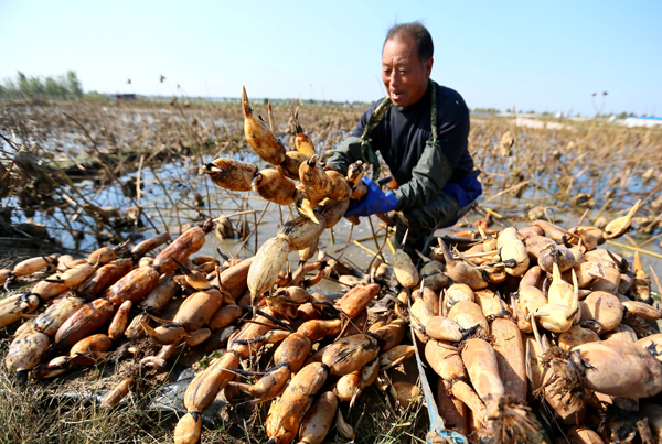 金秋时节,山东省即墨省级高新区大河套村农民种植的雪藕喜获丰收。近年来,当地政府积极鼓励农民以公司、合作社、家庭农场、农户等相结合的农业产业化经营模式,实现种植雪藕精准扶贫、增收致富。农民种植的雪藕亩产达5000余斤,畅销山东各地及周边地区。图为雪藕种植户在池塘里收获雪藕。