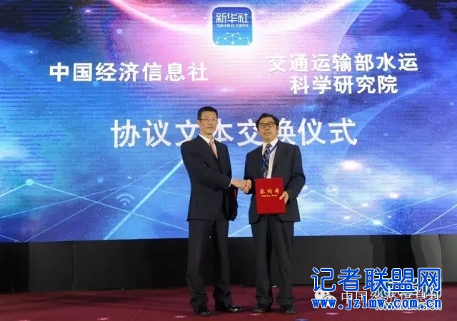 图为中国经济信息社总裁徐玉长和交通运输部水运科学研究院副院长贾大山签署合作协议。