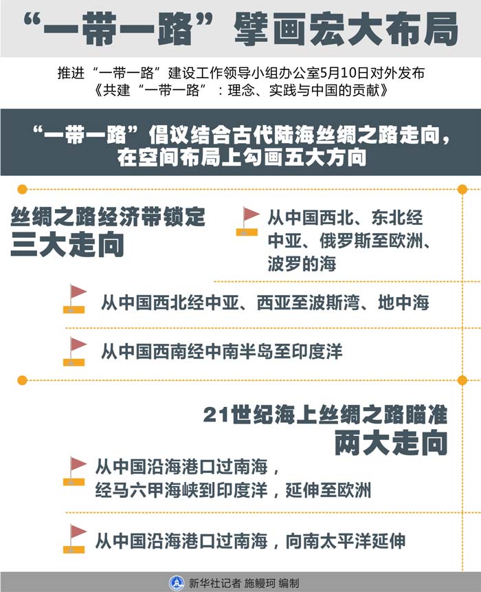 循着丝路上的声声驼铃与碧海中的帆樯舟楫,“一带一路”倡议结合古代陆海丝绸之路走向,在空间布局上勾画五大方向。