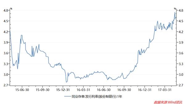 数据显示,股份制银行1年期同业存单发行利率,已从去年10月的2.9%上升至目前的4.6%。而今年4月,同业存单发行量环比大幅减少7200多亿元,也表明金融去杠杆已见成效。