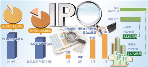 据Wind数据显示,今年以来截至5月24日,证监会发审委共审核223家拟IPO企业,有185家公司获得通过,通过率为82.96%;去年全年,发审委共审核271家拟IPO企业,有247家公司获得通过,通过率为91.14%。IPO通过率的明显下滑,体现了监管层对首发企业审核趋严的态势。