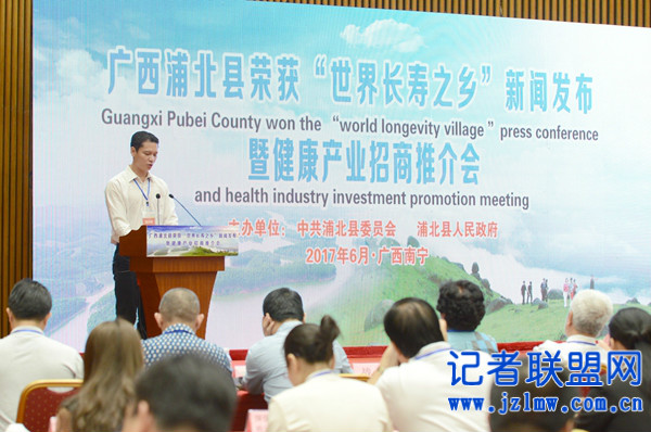中国记者联盟网 广西讯 (记者 田建海) 2017年6月12日,广西浦北县荣获“世界长寿之乡”新闻发布暨健康产业招商推介会在广西南宁举行。