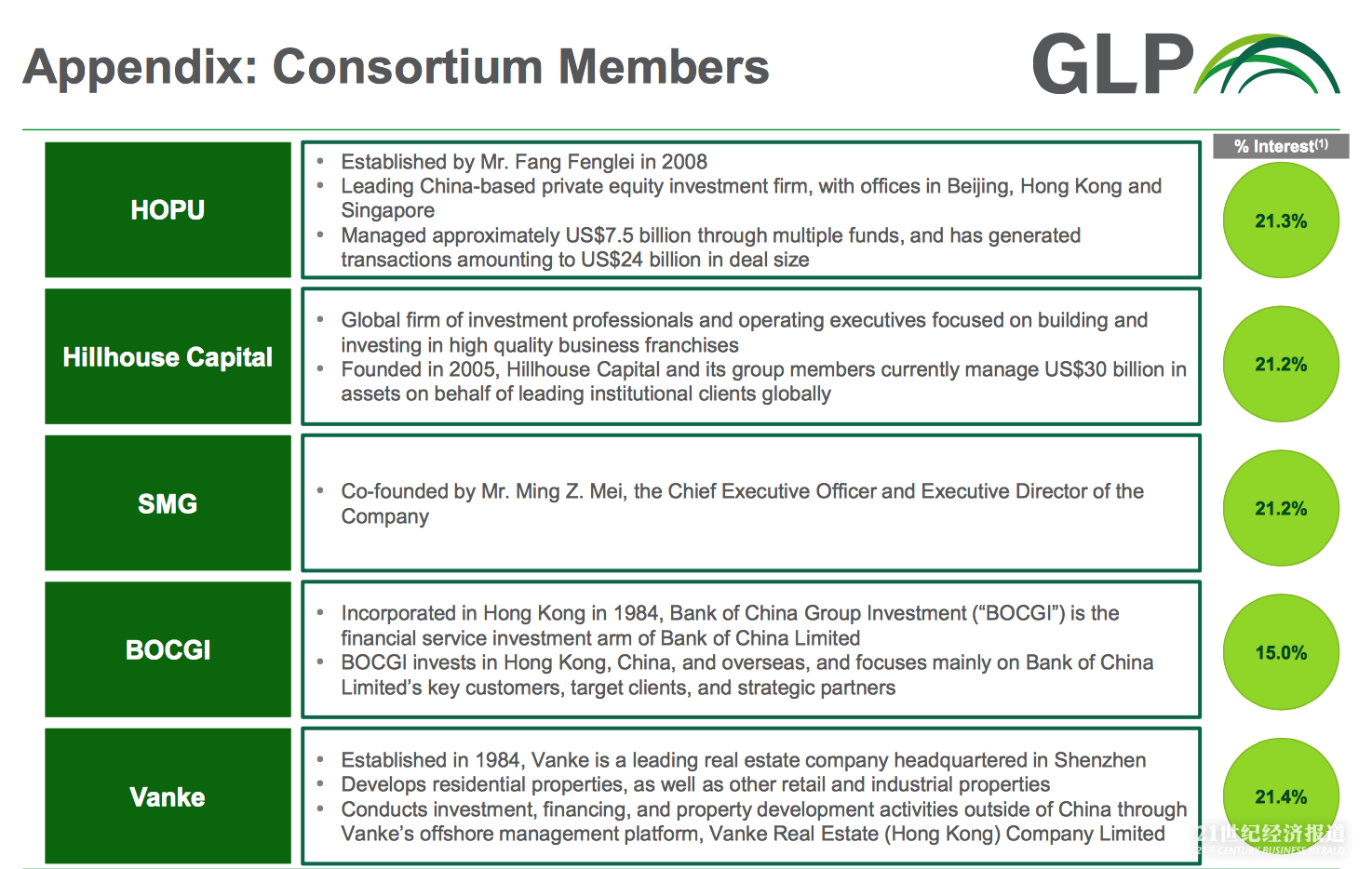 中国财团方面的股权结构为,厚朴投资占股21.3%、万科集团占股21.4%、高瓴资本占股21.2%、中银集团投资有限公司占股15%、普洛斯管理层梅志明联合创立的SMG基金占股21.2%。