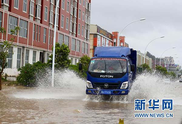 7月30日,福建省福清市高山镇路面出现大面积积水,一辆货车涉水通过。当日6时前后,今年第9号台风“纳沙”在福建省福清市沿海登陆,登陆时中心附近最大风力有12级。 新华社记者姜克红摄