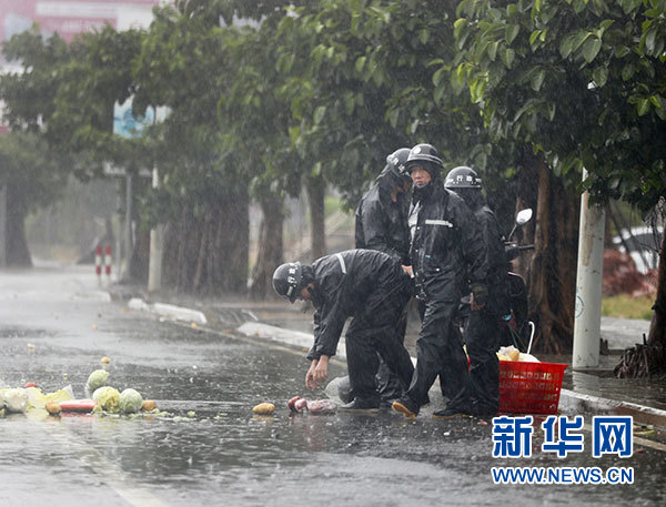 7月30日,福建省福清市几名工作人员在帮助行人捡拾掉落的蔬菜。当日6时前后,今年第9号台风“纳沙”在福建省福清市沿海登陆,登陆时中心附近最大风力有12级。 新华社记者姜克红摄