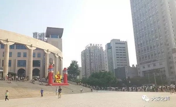 早上七点多,排队等候图书馆开门的读者已排到马路边