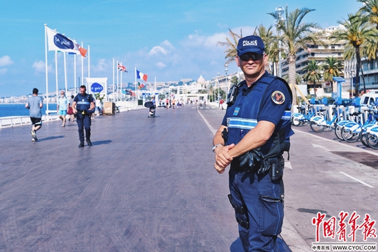 尼斯“英国人散步大道”上,随时都有执勤的警察。摄影:吴勋 高鑫诚