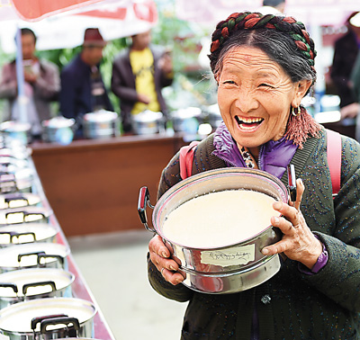 8月19日,一场酸奶评比活动在西藏拉萨城关区娘热乡牧场举行,20多户牧民把自家做的酸奶拿给美食家和品尝者打分,选出最鲜美的酸奶。图为牧民仓琼带着自家酸奶参加评比。